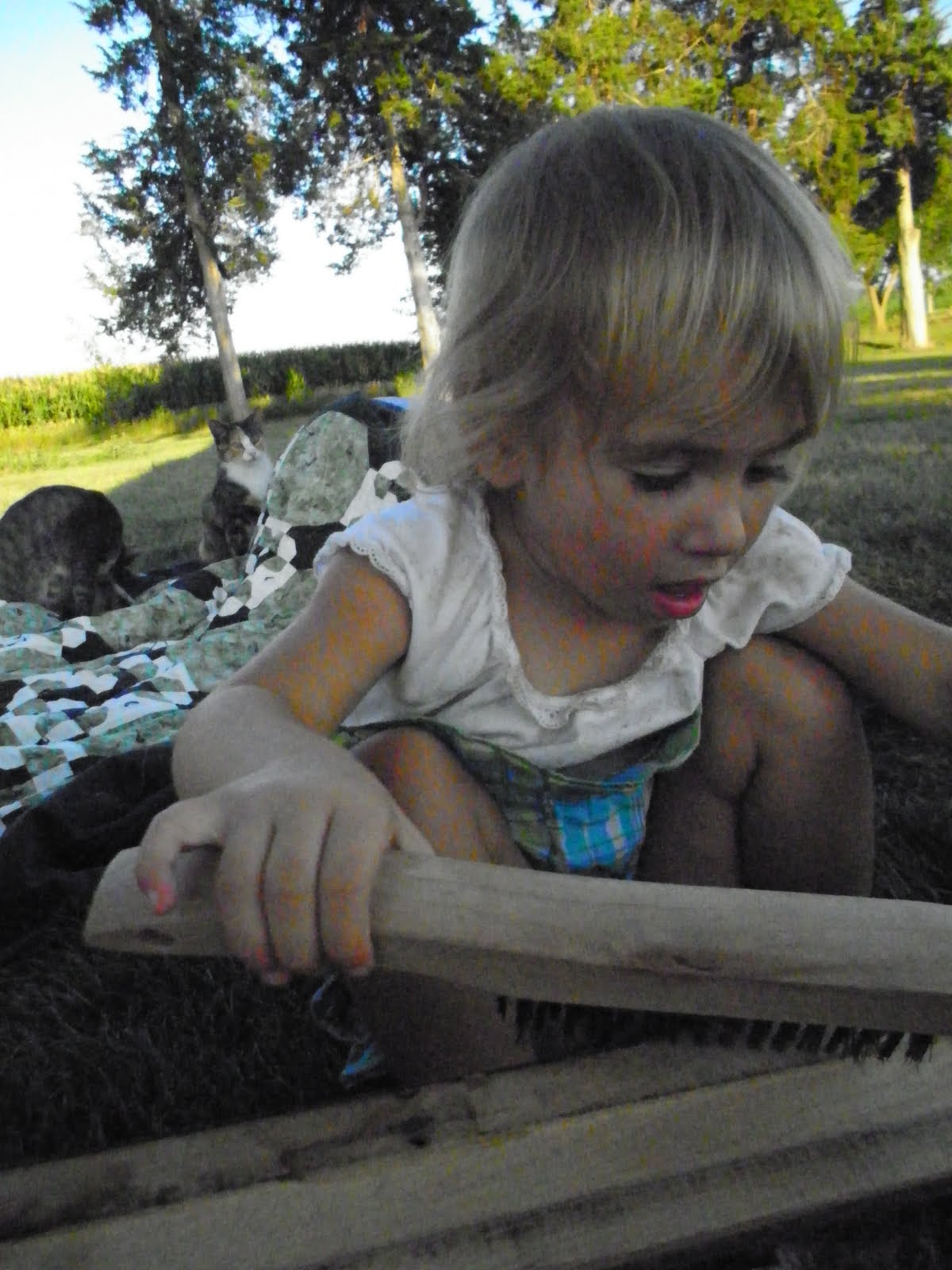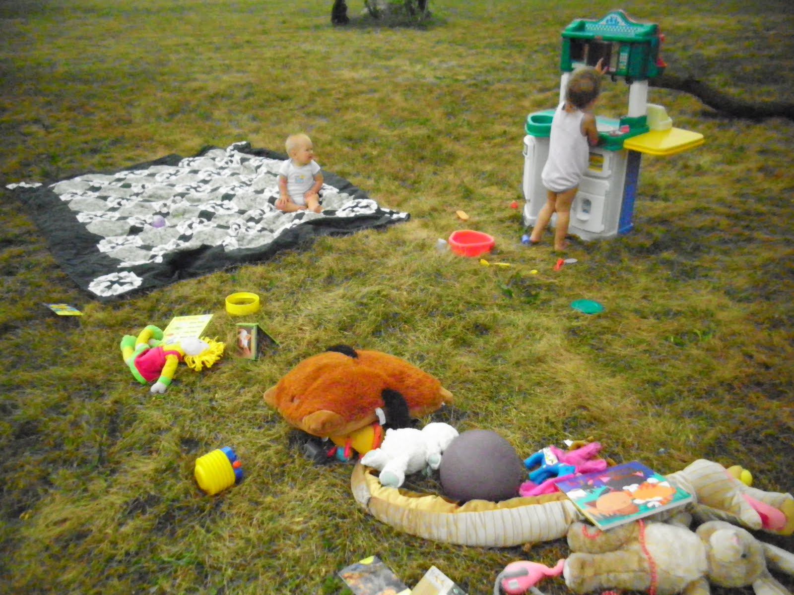 However, I rarely get everything done while they slumber.  I have no qualms letting the girls watch me work–why not enjoy the great outdoors when we own a lovely sliver of it?  I spread a blanket on the lawn, Evelyn drags out every toy she owns and her and Claire entertain themselves for quite a while.