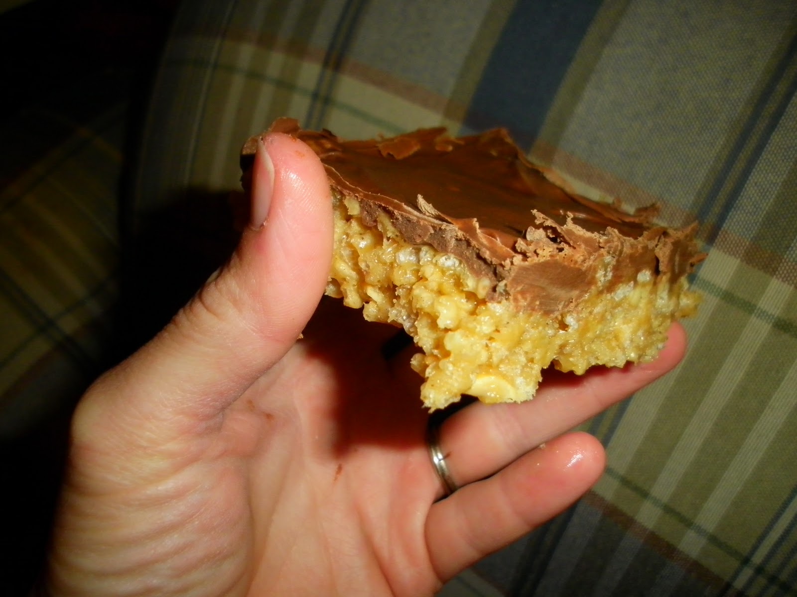Be careful not to scorch. If having difficulty making the mixture smooth, beat with a hand mixer. Spread evenly over rice crispies and let cool.