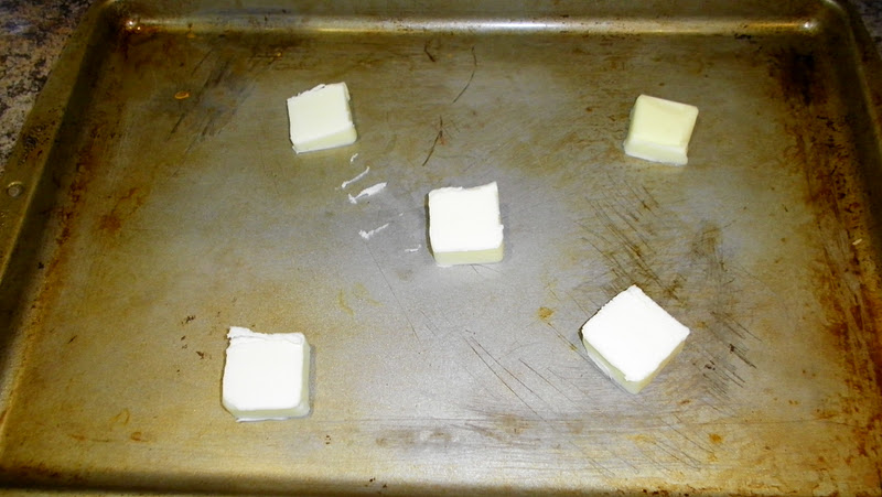 Slice butter and place on a pan. Set the oven to 450F and while it’s heating, stick the pan of butter inside to melt (It’ll only take a couple minutes–don’t forget about it in the oven!).