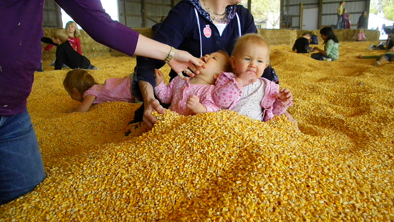 The place is perfect for children. Between swimming in a pool of corn (and wrestling babies to keep the dusty kernels out of their mouths), milking a fake cow, mini tractor rides, farm animals galore, burlap sack slides, jumping on a giant pillow, a winding corn maze and finally wandering the pumpkin fields in search of the perfect jack-o-lantern, the girls had no trouble conking out that night.