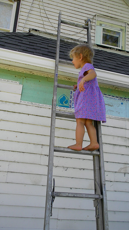 When I started working on the siding, I only did it when the girls were taking their afternoon naps. It advanced into letting Evelyn watch while she played on her jungle gym or had a picnic with her dolls on the lawn. It wasn’t long though before she became extremely interested in the ladder.