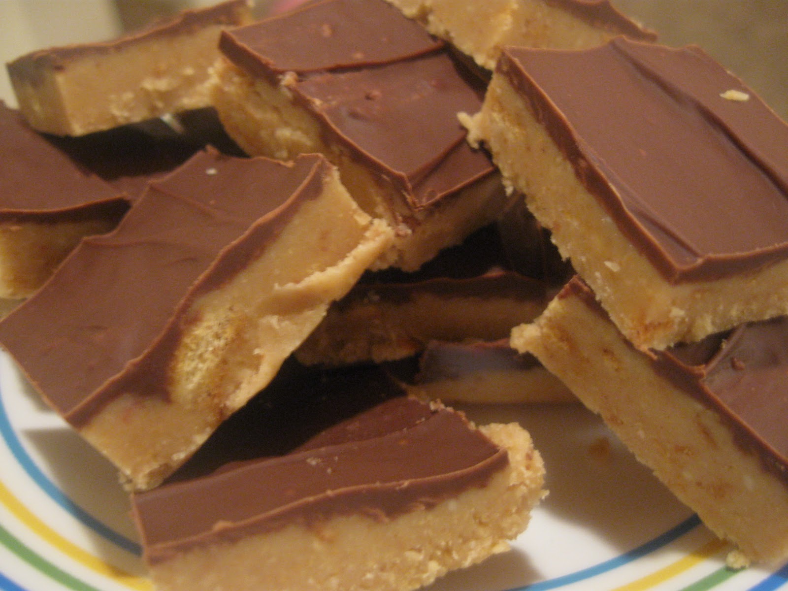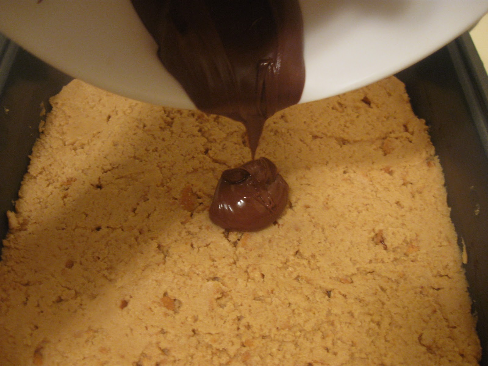 Spread in a 9×9 pan. Melt half a bag (about 6 oz) of chocolate chips in the microwave for thirty seconds, stirring and returning to the microwave for thirty seconds until smooth. Spread evenly over the top of the peanut butter mixture.