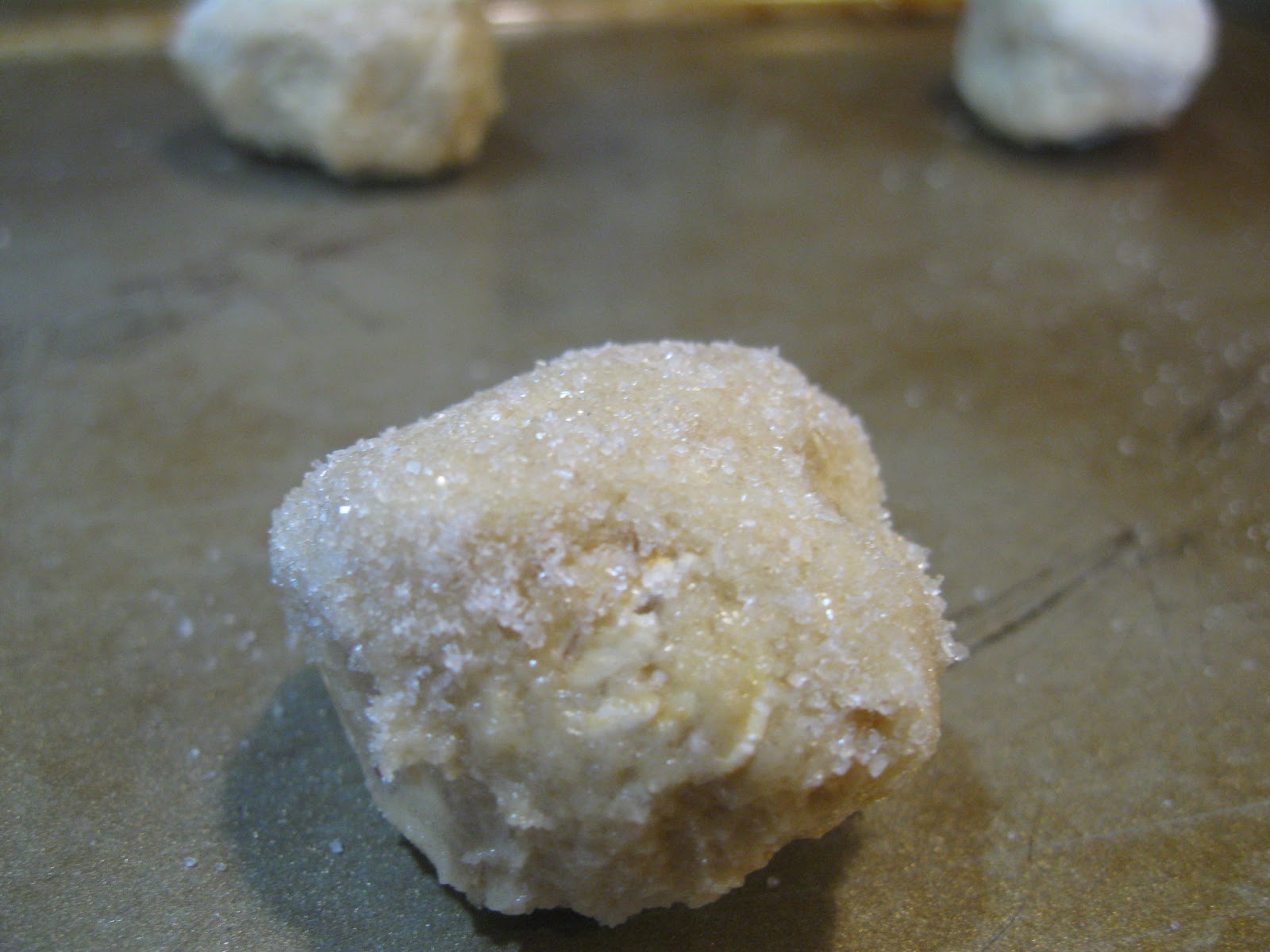 Combine with the previous ingredients. Form into small balls, dip tops in sugar and place on an ungreased cookie sheet.