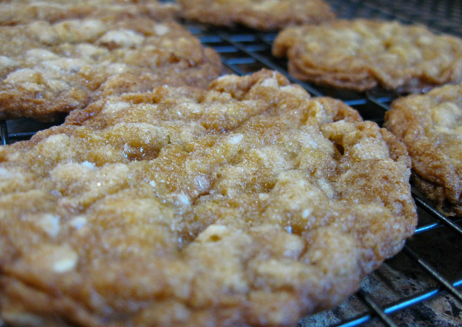 Bake at 375F for 8 to 12 minutes.  Be careful not to overbake (the cookies will be thin and slightly soft when pulled from the oven but will crisp up when cooled).  Place on a cooling rack or paper bag immediately.