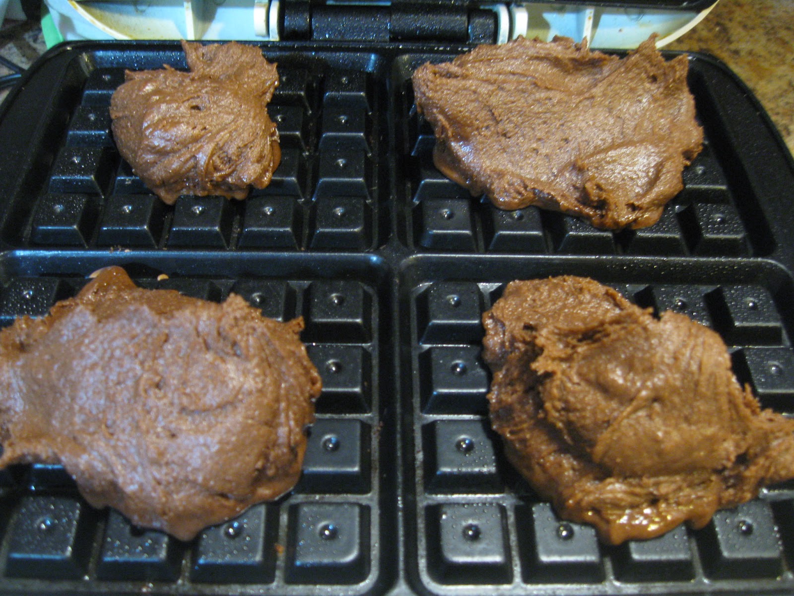 Heat waffle iron. Spray with cooking spray if not non-stick. Place a heaping spoonful on each square and close for about five minutes or until brownies are cooked through. Serve hot.