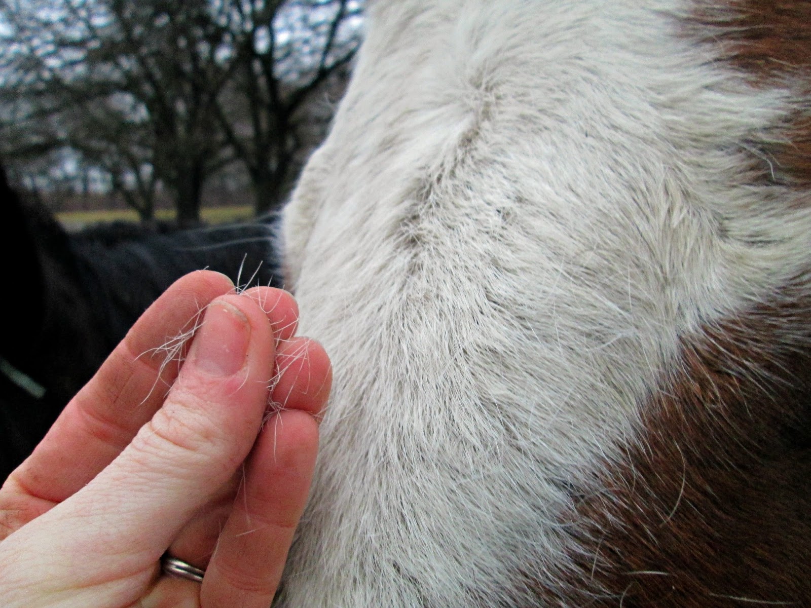 The shedding of the horse (Note that their white hair always starts first).