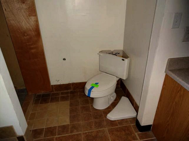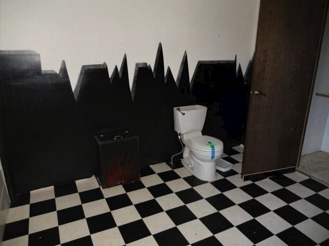 Of course, the mismatched tile, poor drywalling and the tiny raised shower aren’t our favorite. It does have a few redeeming qualities, like the cute little vanity and plenty of light fixtures. It’ll need a few alterations to fix the flooring (and wouldn’t a nice big walk-in shower instead of an unused closet be neat?), but as far as guests are concerned, they get to have a functional bathroom all to themselves.