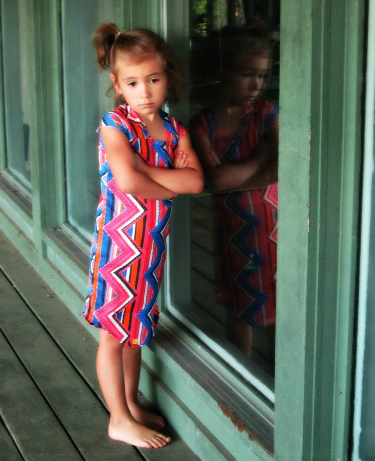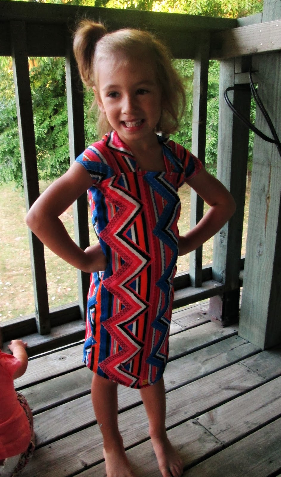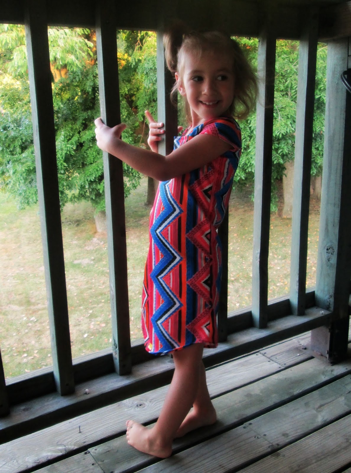 Evelyn discovered this zany fabric at a garage sale over the summer and asked that I make a dress out of it. The print is so bold that I decided to keep the cut simple and it turned out pretty cute. It took less than an hour to cut and sew (including a baby constantly tugging on me and the fabric).