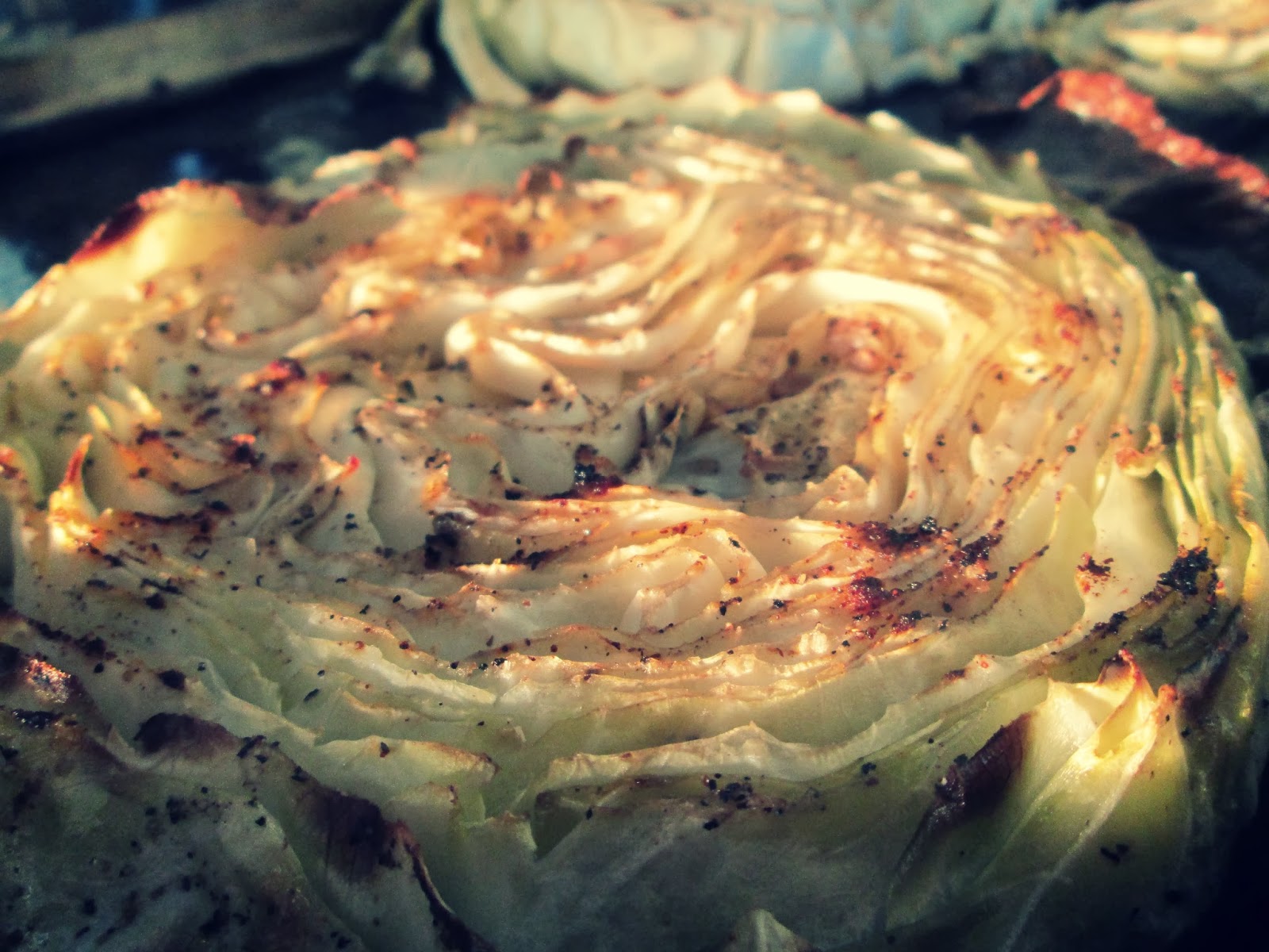 Preheat oven to 400F.  Slice cabbage into one inch slices.  Mix all ingredients except the chili powder and brush on one side of the cabbage and place on a baking pan.  Pour and brush remaining marinade on other side of cabbage.  Sprinkle with desired amount of chili powder.  Bake for about 40 to 50 minutes, depending on desired tenderness.