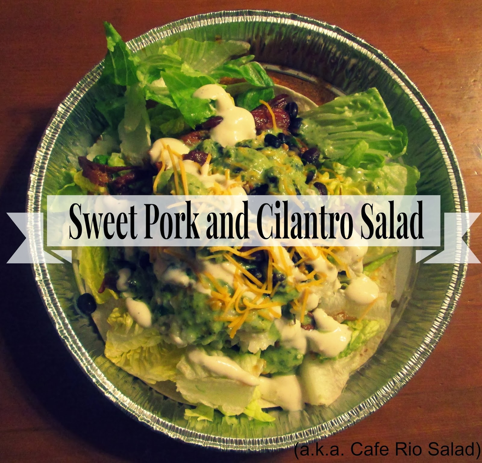 My sister made these before we left last Christmas and I fell in love. I call them sweet pork and cilantro salad but they’re really a Cafe Rio salad–a restaurant I’ve never patronized. If this is the kind of food they serve, I sure would. Though most recipes call for Coke to flavor the meat, I worked around that (I never have pop on hand anyway). It is a more intensive dinner than I usually make, but it was well worth it (and we enjoyed leftovers for several additional meals).