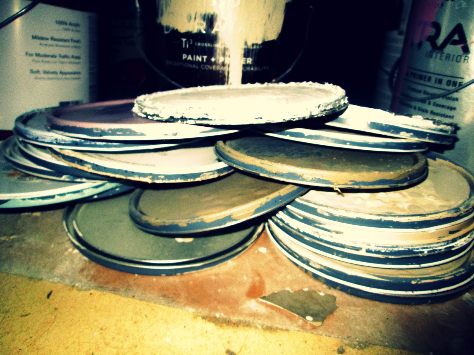 I’ve started saving the lids from used up paint cans to sort of keep track of just how many gallons it takes to paint our house, top to bottom, inside and out. I’ve gotten to about thirty but that’s not including several five gallon drums of primer or the dozen or so paints that are currently being employed on ceilings and trim and doors and walls. I estimate I’m about halfway done with painting.