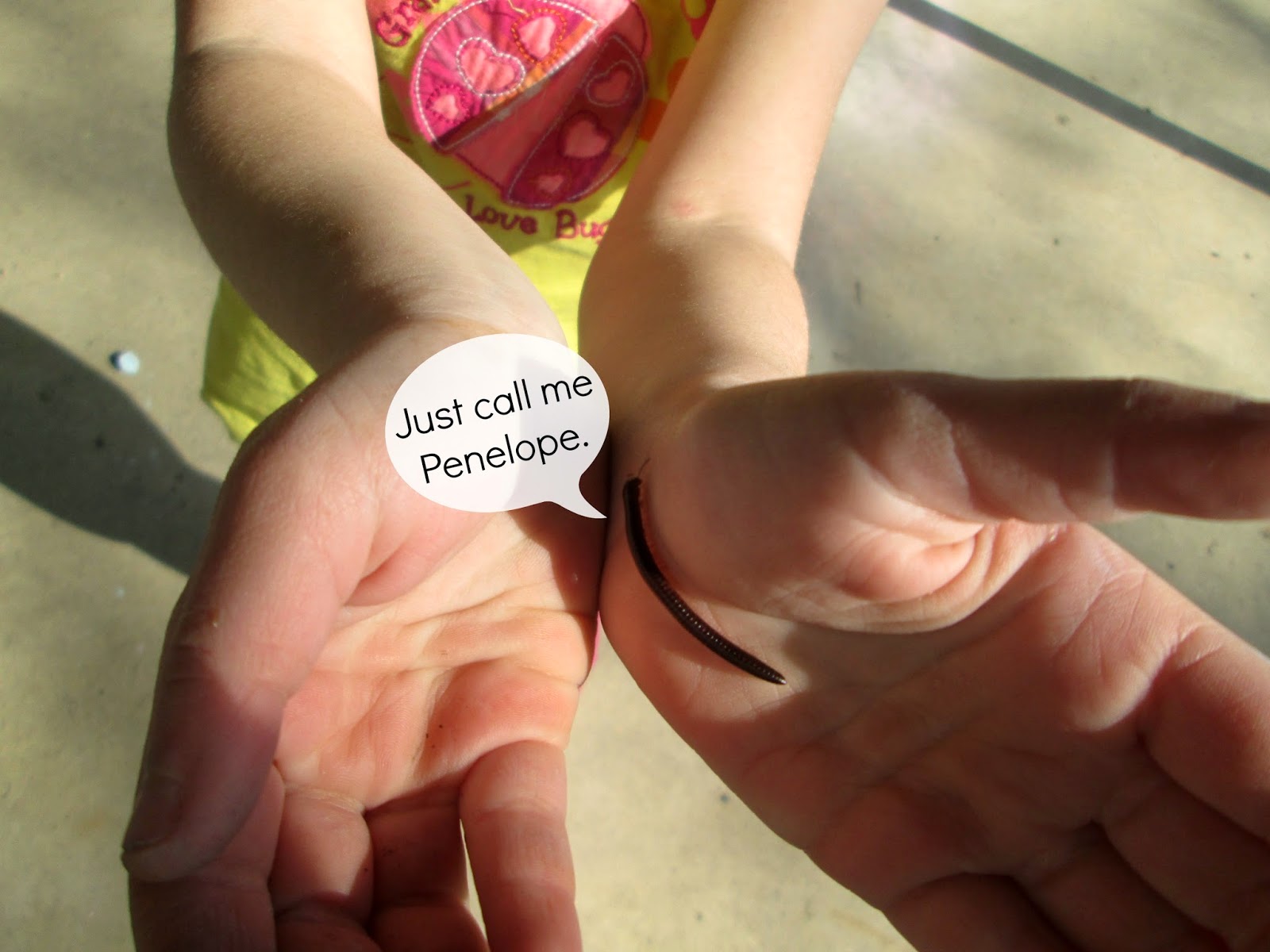 While doing some painting outside, the girls overturned some rocks and found a millipede. At first, they were hesitant until I reassured them they’re pretty gentle creepy crawlies. When they asked what they were called, I told them millipede but they somehow heard penelope. It began a lengthy conversation (and occasional argument) about who was going to hold the penelope.