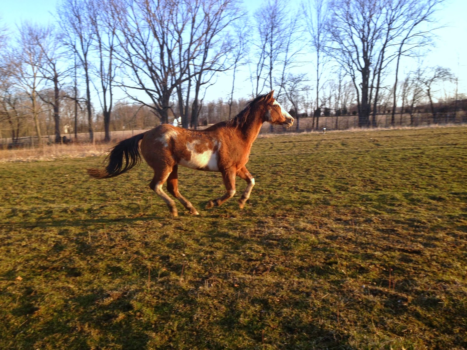 When the horses aren’t stuck in the muddy paddock, eating hay and doing their best to nibble at the green grass within their reach of the fence boundaries, they get to go out and enjoy the tender green shoots. Their time on the pasture is limited at the moment because of all the rain and the tendency of their galloping hooves to rip holes in the earth, so I have to trot across the muck and skip their hoof divots to let them out for a few hours.