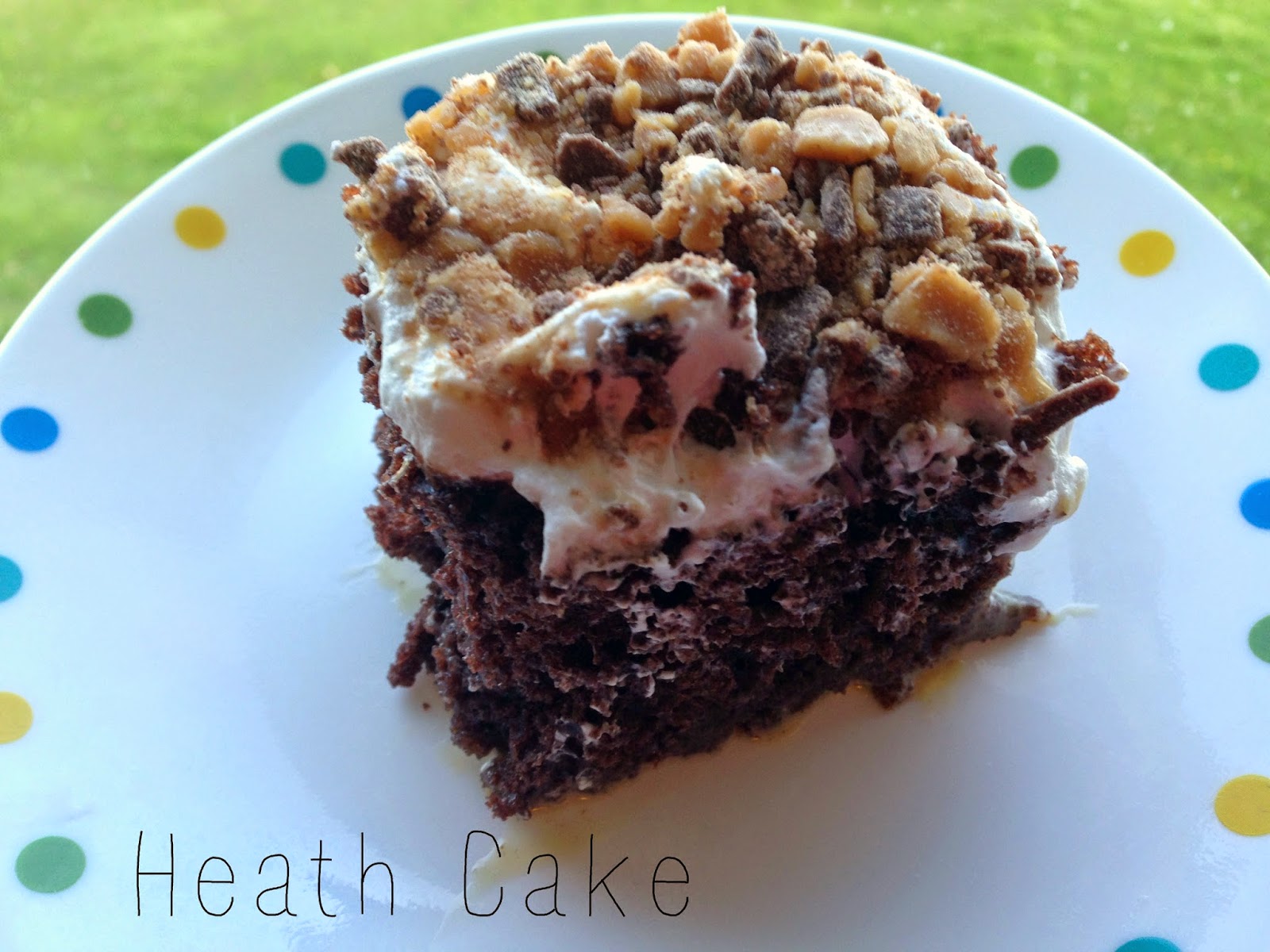 Prepared and bake chocolate cake according to package directions. When baked, remove from oven and wait five minutes, then poke holes in the cake (try using the handle of a wooden spoon). Cool completely then drizzle sweetened condensed milk over entire cake, making sure to pour liberally into holes. Then drizzle caramel on top, also pouring into the holes. Spread the whipped topping over the entire cake and sprinkle with Heath candy bits. Store in fridge until ready to eat.