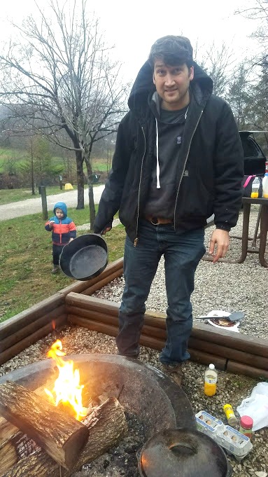 That didn’t stop us. We were up bright and early the next morning (mostly because we couldn’t get everyone to sleep later because they’d all had a good night’s rest) and were up in the chilly rain, cooking breakfast.