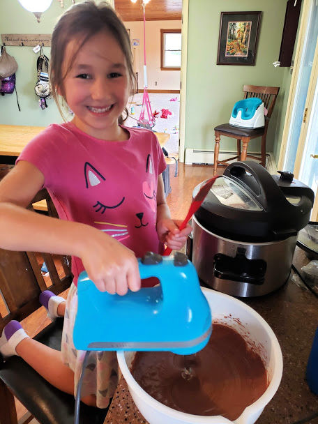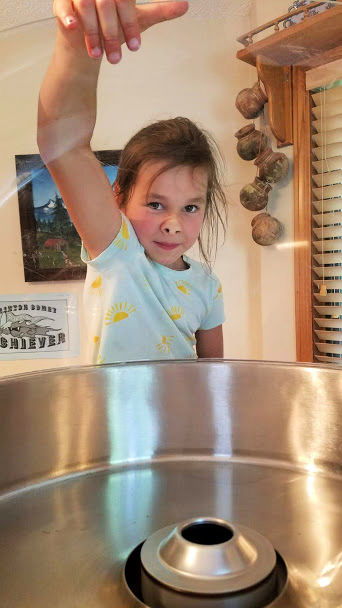 One thing Kate sincerely enjoys doing is helping. More often than not, when I’m in the kitchen, she moseys in and asks if she can do something, whether it’s grind wheat for bread, stir the muffins, slice the fruit, or–her most favorite–lick off the spatula.