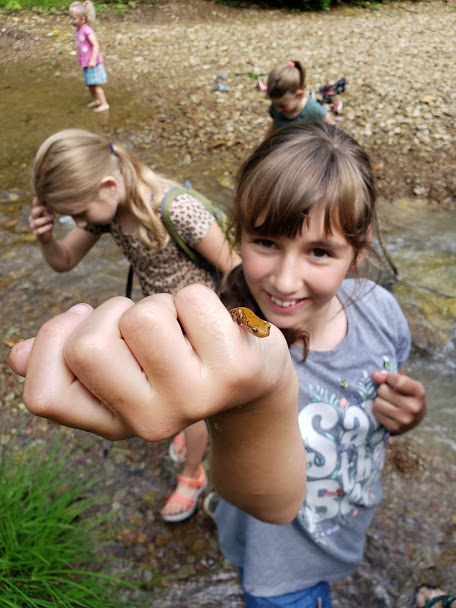 A bit further down, the deer trail we were following crossed the creek. Evelyn jumped down and found a southern two-lined salamander that was bright yellow and feisty. We ooo-ed and aww-ed over her for a few minutes, then let her go on her way.