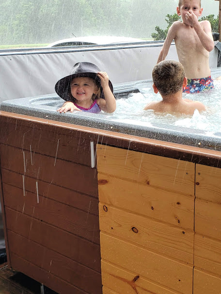 Our hot tub also got a fair amount of use. Though the pond is a relief on a hot day, it hadn’t quite warmed up by the time our guests arrived. If they couldn’t warm up by sitting on the canoe next to Mo…