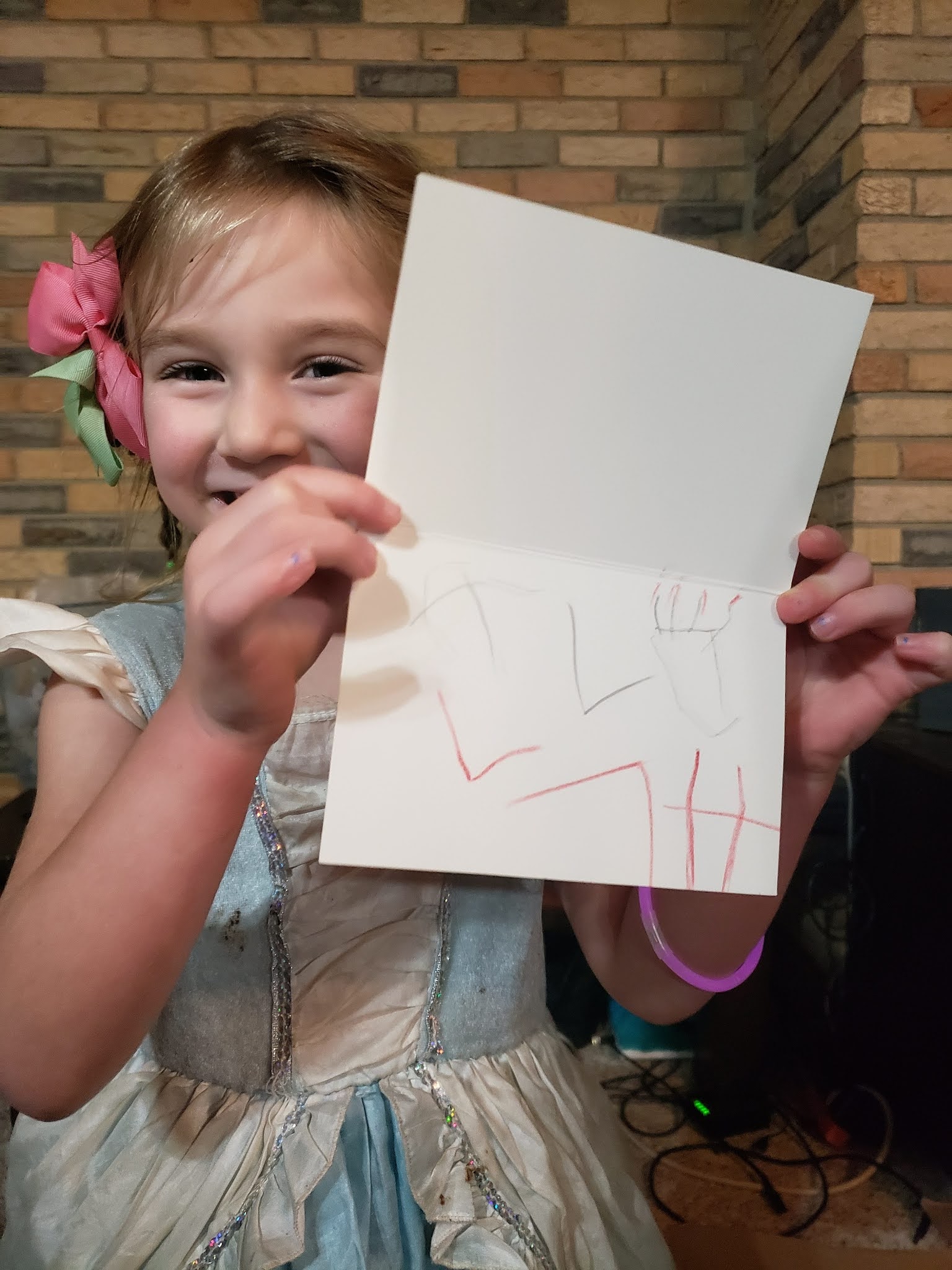 I saw her sneaking off with a card to her bedroom, where she filled it with letters she knows since she can’t actually spell anything yet. Her cake drawing is especially on point. |