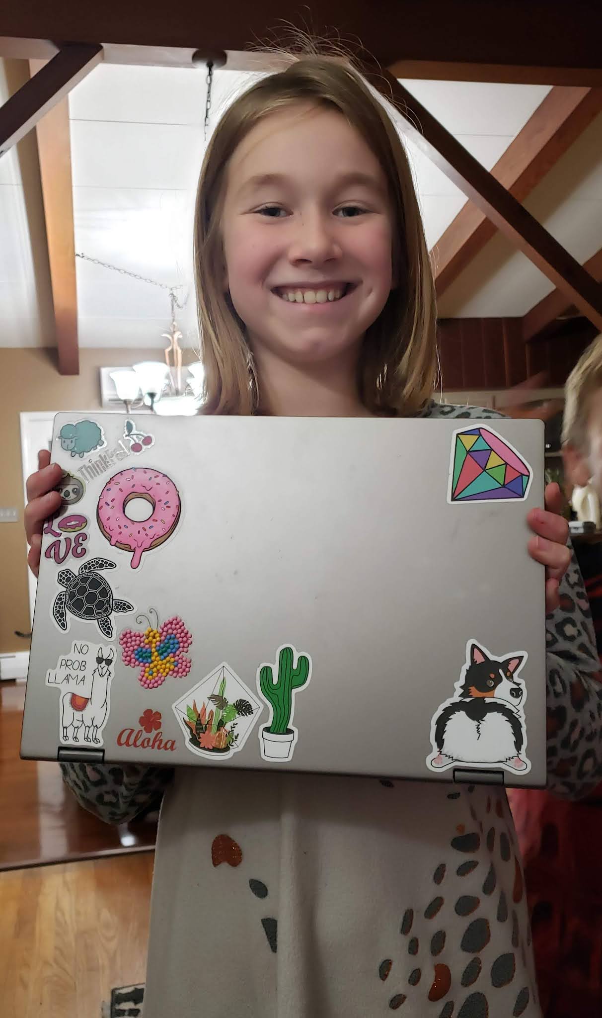 A few minutes later, Claire came wandering out of her bedroom. She’s been going early for choir practice, but wanted to give me her gifts before she left. She’s been saving the points her teacher gives students for good behavior and cashing them in stickers to decorate my computer, so I think of her when I’m writing my next book. Aww…so sweet!